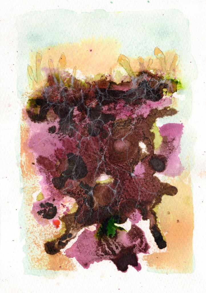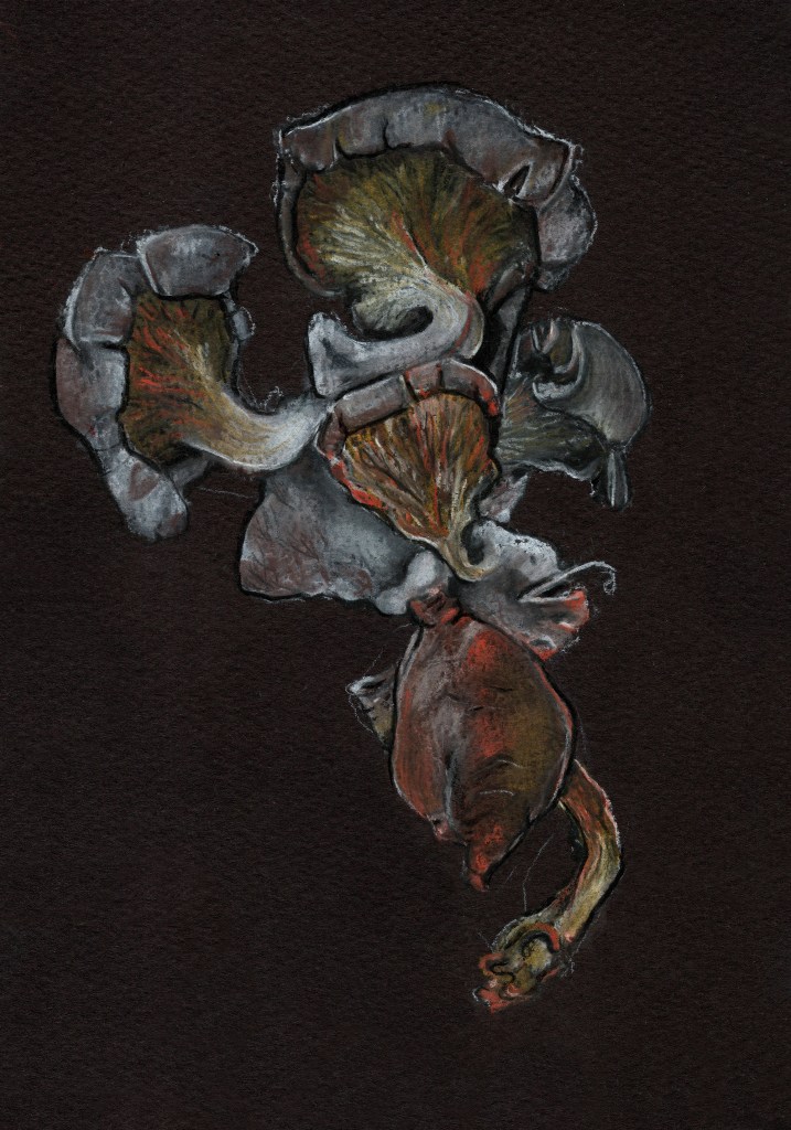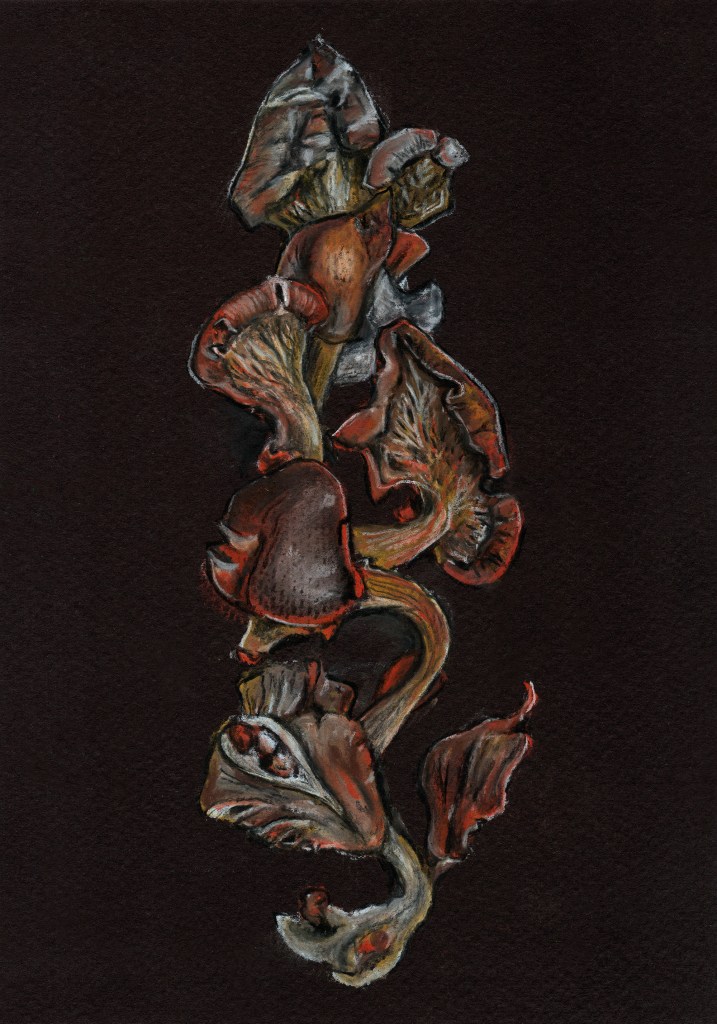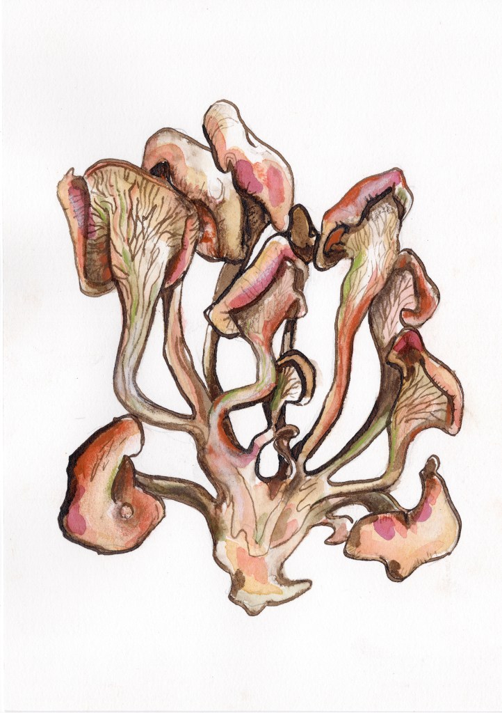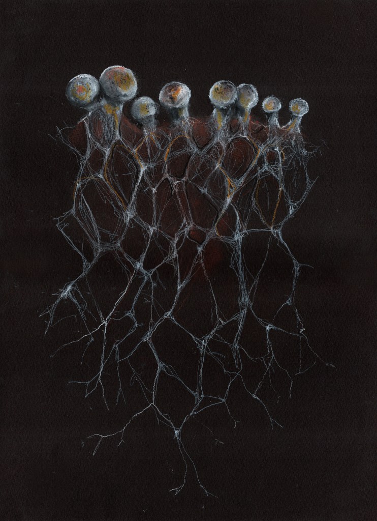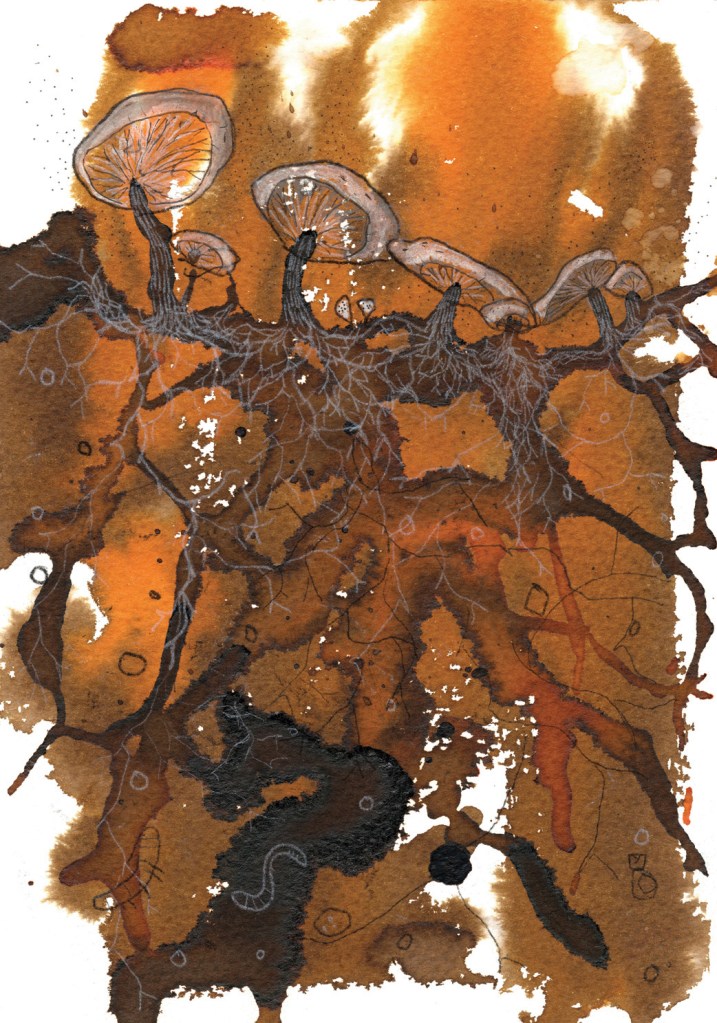 In my first solo exhibition, Fungarium (2024), I took a tentative step into these dark spaces, and I now present my continuing journey in Fungarium: Rambling On (22-27 July 2025). My pencil drawings are studied celebrations of the mushroom. I have been collecting dried specimens, observing the whorling, twisted shapes that occur upon dehydration, with gnarly forms that conjure fantastical characters straight out of folklore. In inks I take a dive into the subterranean realm of mycelium, the microscopic, vegetative part of a fungus that weaves beneath our feet. As an aphantasic, I do not experience mental imagery, so here I just ‘see what happens’, creating imagined realms by letting the inks express themselves in damp paper before working over in more detailed layers – if I cannot see then I can imagine.