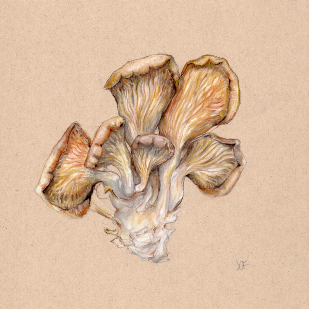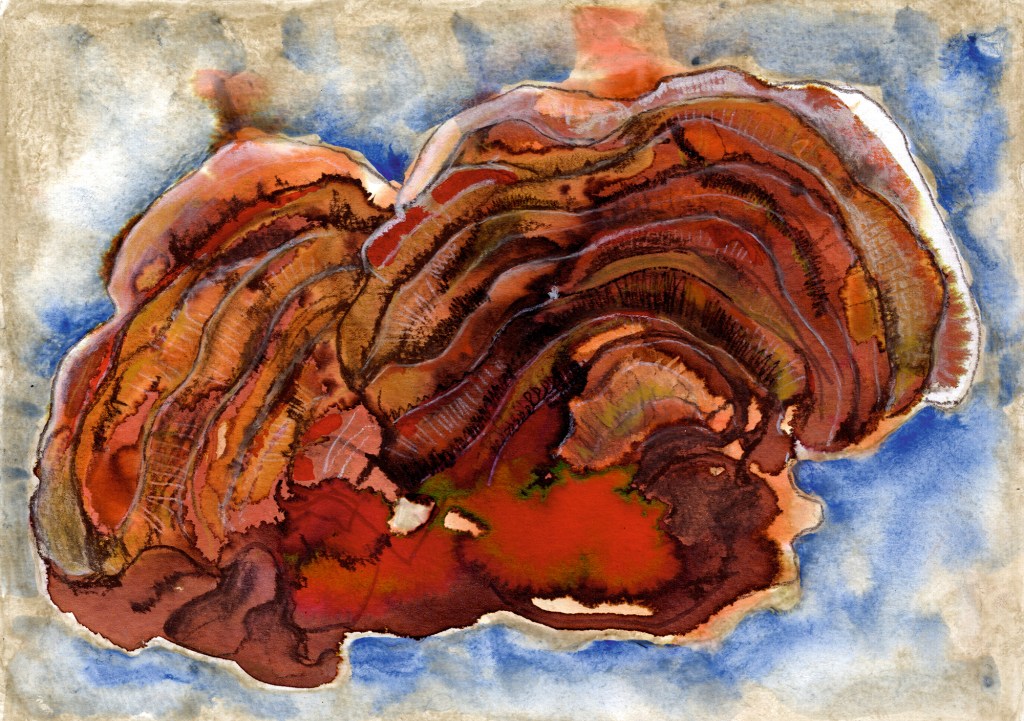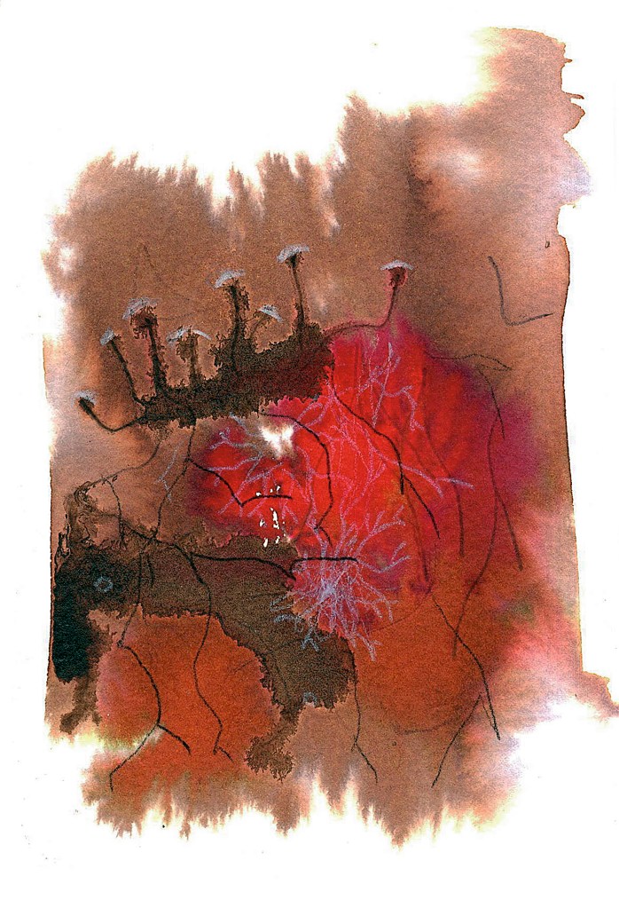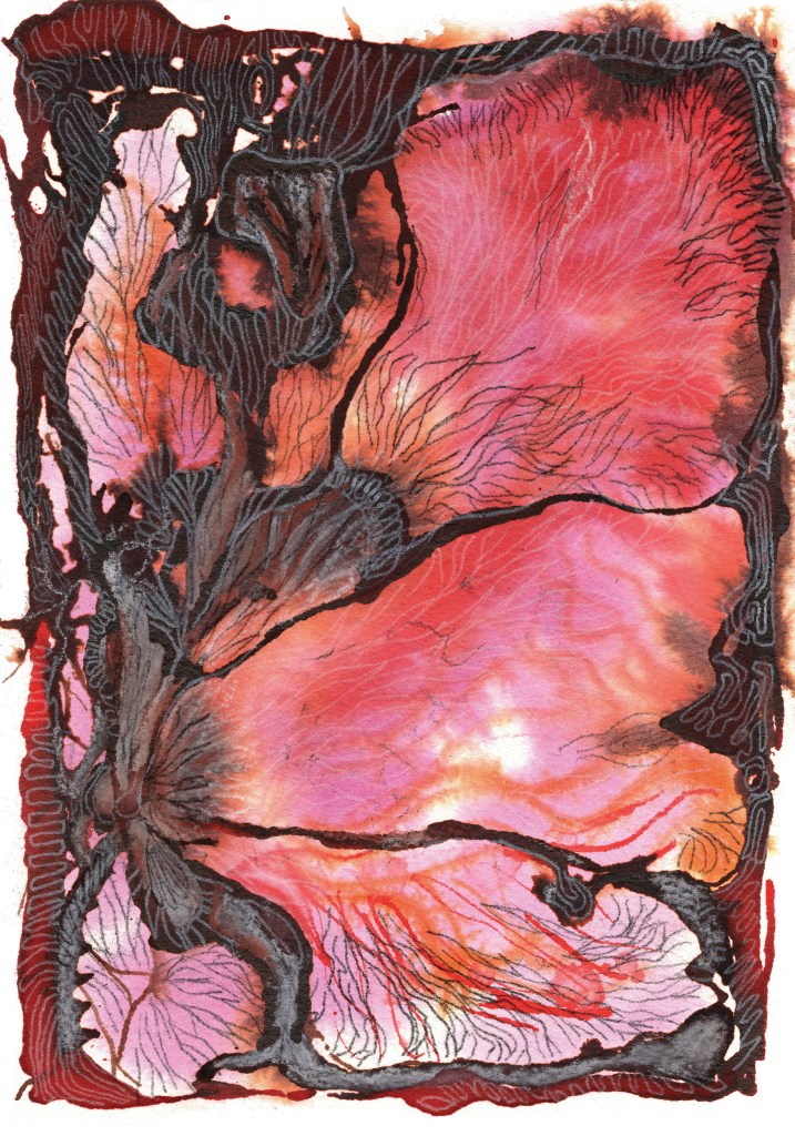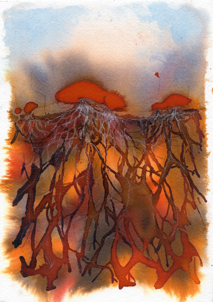 In my first solo exhibition, Fungarium (2024), I took a tentative step into these dark spaces, and I now present my continuing journey in Fungarium: Rambling On (22-27 July 2025). My pencil drawings are studied celebrations of the mushroom. I have been collecting dried specimens, observing the whorling, twisted shapes that occur upon dehydration, with gnarly forms that conjure fantastical characters straight out of folklore. In inks I take a dive into the subterranean realm of mycelium, the microscopic, vegetative part of a fungus that weaves beneath our feet. As an aphantasic, I do not experience mental imagery, so here I just ‘see what happens’, creating imagined realms by letting the inks express themselves in damp paper before working over in more detailed layers – if I cannot see then I can imagine.
