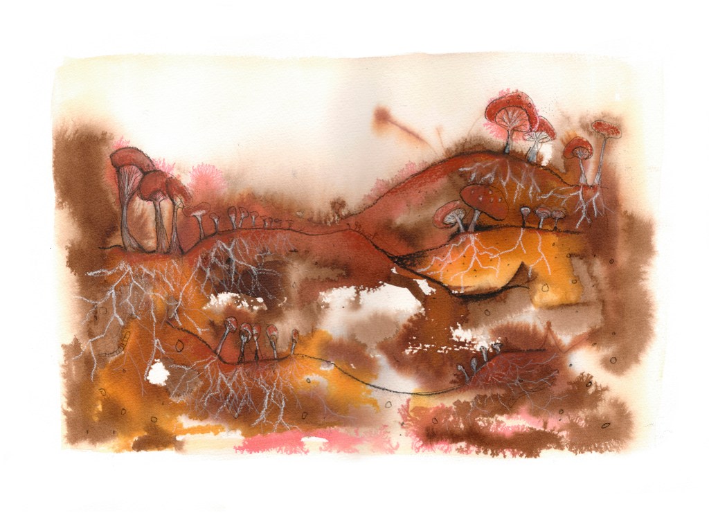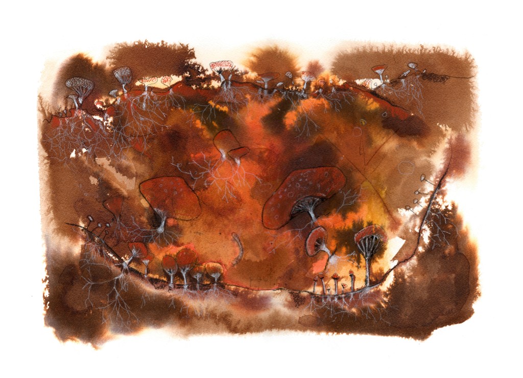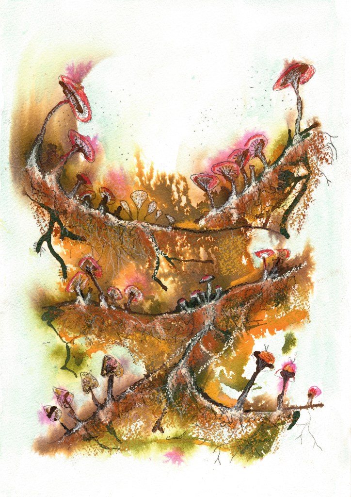 Having branched away from animals more than 1billion years ago, fungi are neither plant nor animal, sharing more DNA with us than they do with plants. They are master decomposers, transforming and moving energy so that it may generate and support new life. They have the ability to decompose plastics and petrochemicals, and to convert toxic waste into chemical energy for growth. They are intelligent communicators, explorers and decision makers, with species that interact with plants and trees, swapping nutrients and energy in a system referred to as the Wood Wide Web. Without fungi we would not have bread, beer, cheese, chocolate, coffee, wine… and yet, we know very little about this abundant kingdom. There are thought to be over 2.5million fungi species on Earth*, with more than 90 percent of those as yet unknown to science. Most fungi live out of sight.